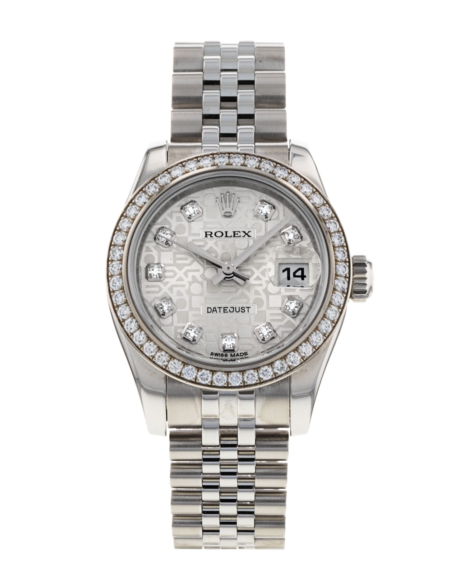 This Rolex Datejust Lady 179384 has a silver jubilee diamond dial and a bracelet strap. This Rolex has undergone a thorough inspection of water resistance, accuracy, functionality and condition to determine the level of reconditioning required to meet our strict standards. It has also been referenced against technical documents and manufacturer records where available to ensure authenticity and a clean history. All our watches have a 24-month warranty for your peace of mind. One of our skilled polishing technicians has removed marks on the case and bracelet of this watch, brought about by daily wear and tear, which is why this watch does not come with the remaining manufacturer’s warranty.