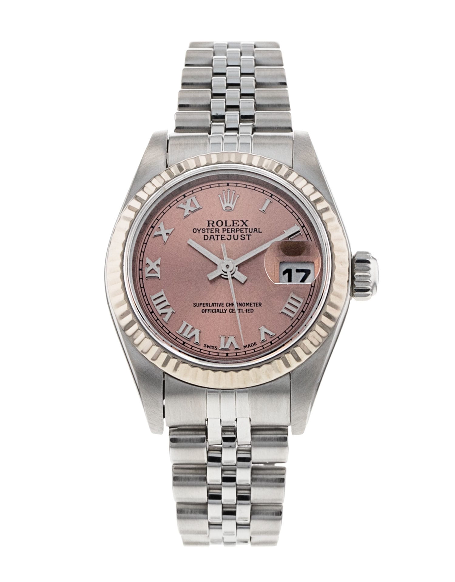 This Rolex Datejust Lady 79174 has a salmon roman numeral dial and a bracelet strap. This Rolex has undergone a thorough inspection of water resistance, accuracy, functionality and condition to determine the level of reconditioning required to meet our strict standards. It has also been referenced against technical documents and manufacturer records where available to ensure authenticity and a clean history. All our watches have a 24-month warranty for your peace of mind. One of our skilled polishing technicians has removed marks on the case and bracelet of this watch, brought about by daily wear and tear, which is why this watch does not come with the remaining manufacturer’s warranty.