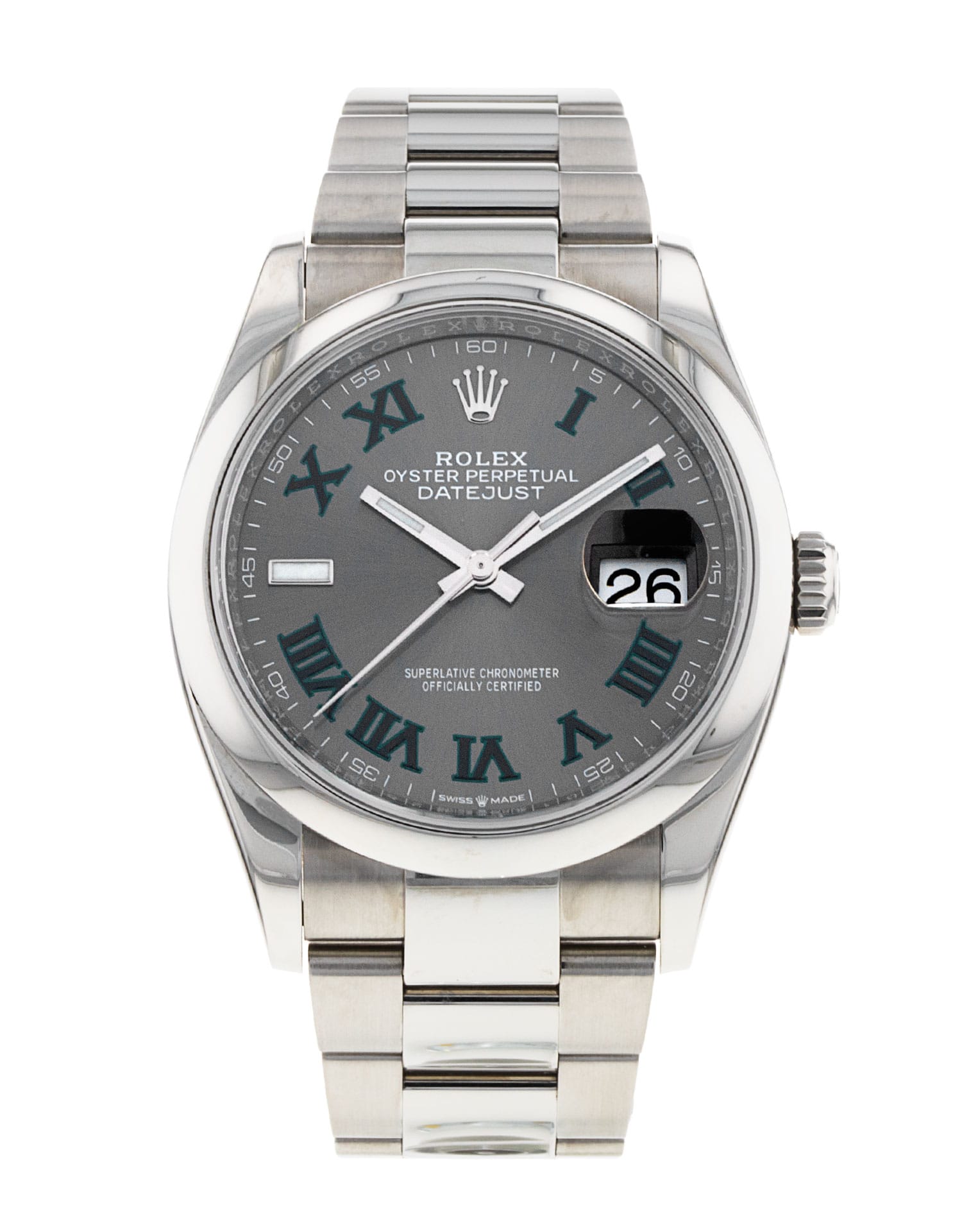 This Rolex Datejust 126200 has a slate roman numeral dial and a bracelet strap. This Rolex has undergone a thorough inspection of water resistance, accuracy, functionality and condition to determine the level of reconditioning required to meet our strict standards. It has also been referenced against technical documents and manufacturer records where available to ensure authenticity and a clean history. Our watches have a 24-month warranty for your peace of mind, in conjunction with any remaining manufacturer’s warranty from new or from service. To maintain the manufacturer’s warranty on this watch, it has not been polished in our service centre.