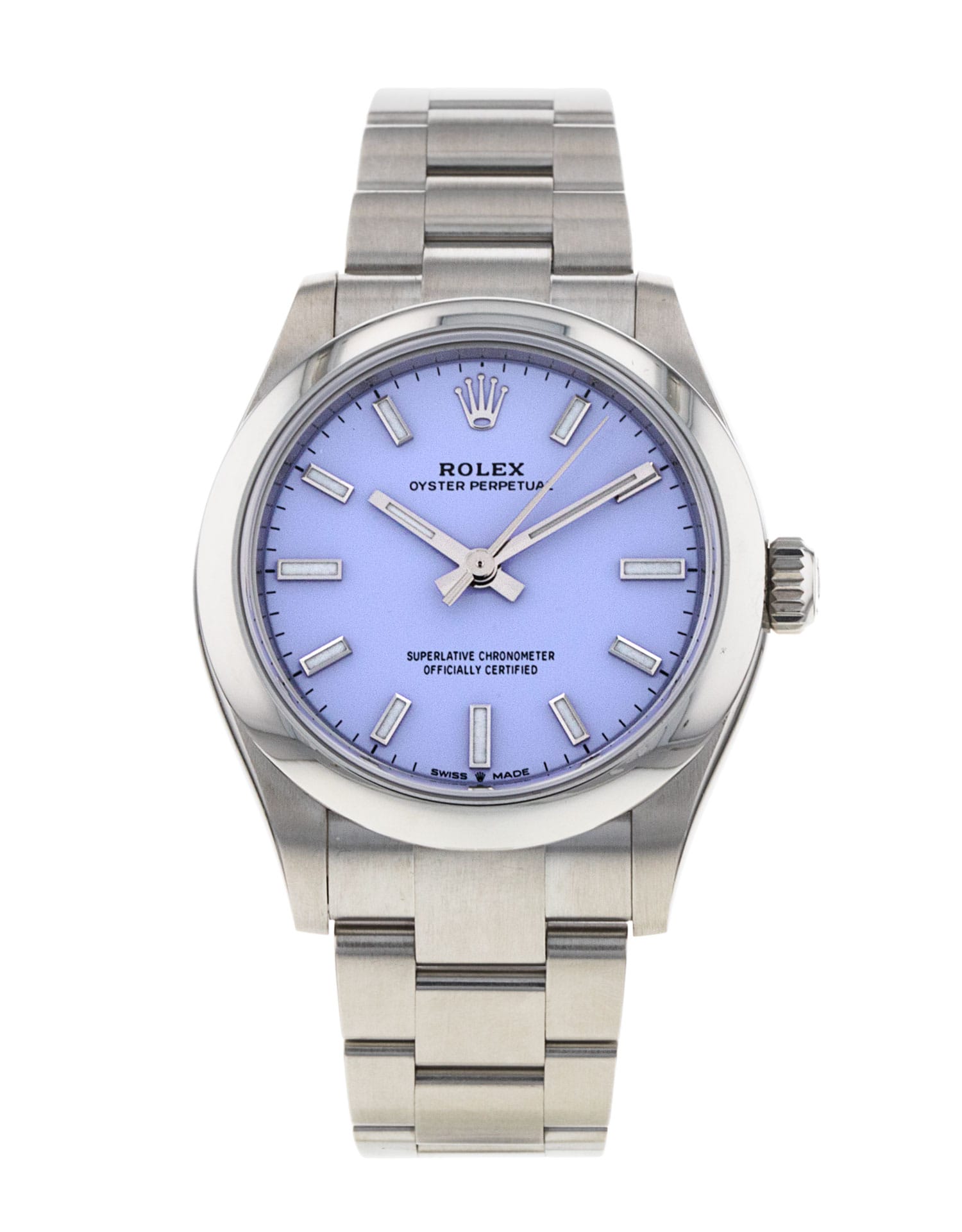 This Rolex Oyster Perpetual 277200 has a lavender dial and a bracelet strap. This Rolex has undergone a thorough inspection of water resistance, accuracy, functionality and condition to determine the level of reconditioning required to meet our strict standards. It has also been referenced against technical documents and manufacturer records where available to ensure authenticity and a clean history. Our watches have a 24-month warranty for your peace of mind, in conjunction with any remaining manufacturer’s warranty from new or from service. To maintain the manufacturer’s warranty on this watch, it has not been polished in our service centre.